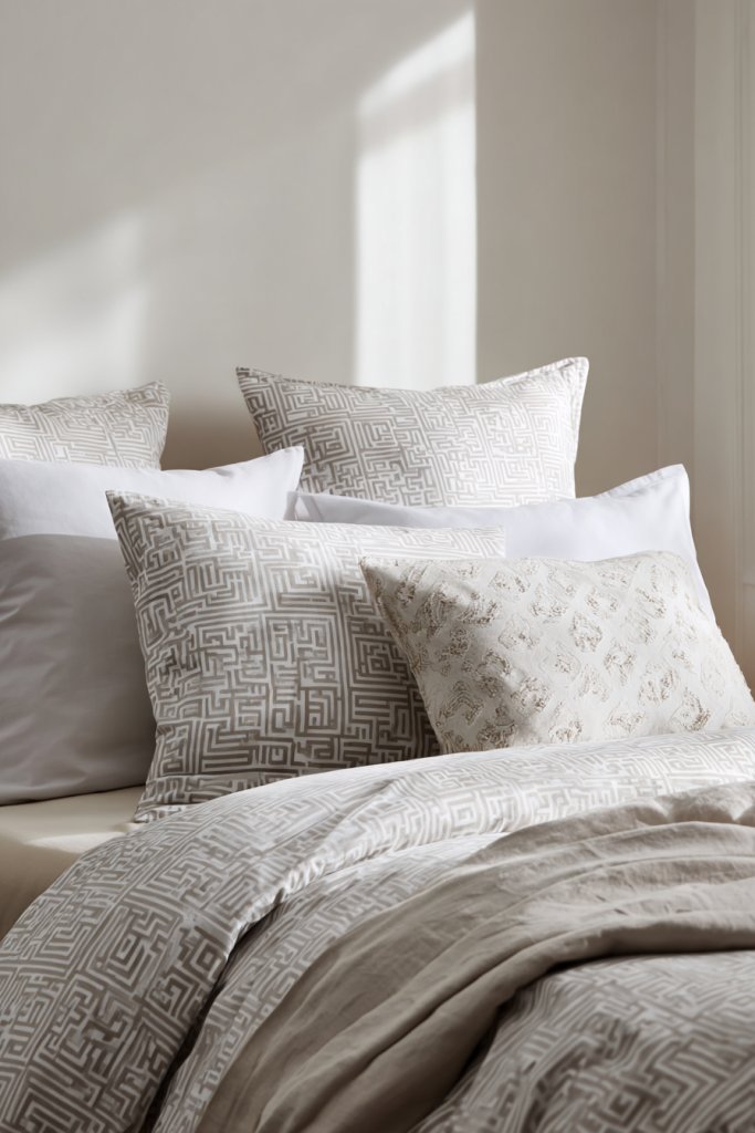 Imagine cushions with soft, geometric embroidery or throws with understated chevron or hexagon patterns. The textures and shapes create visual rhythm that guides the eye across the room. Pair these textiles with plain furniture and neutral walls to highlight their subtle pattern. The overall effect is modern, refined, and effortlessly stylish.