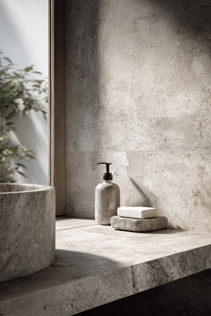 Picture a concrete countertop paired with a slate or pebble stone accent wall. A marble tray or a slate coaster set introduces natural patterns and textures. These elements develop character over time, adding depth and a tactile dimension. The overall aesthetic feels organic, grounded, and refined, emphasizing natural beauty.