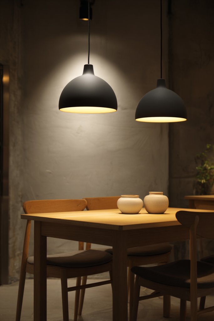 Picture a sleek pendant in matte black or brushed metal hanging from the ceiling, casting a gentle glow over a dining table. Wall-mounted sconces with fabric shades or wooden accents add layers of ambient light. The soft radiance highlights natural textures and neutral tones, creating a harmonious, restful environment. Candles or LED diffusers can complement the fixtures, adding a touch of tranquility.