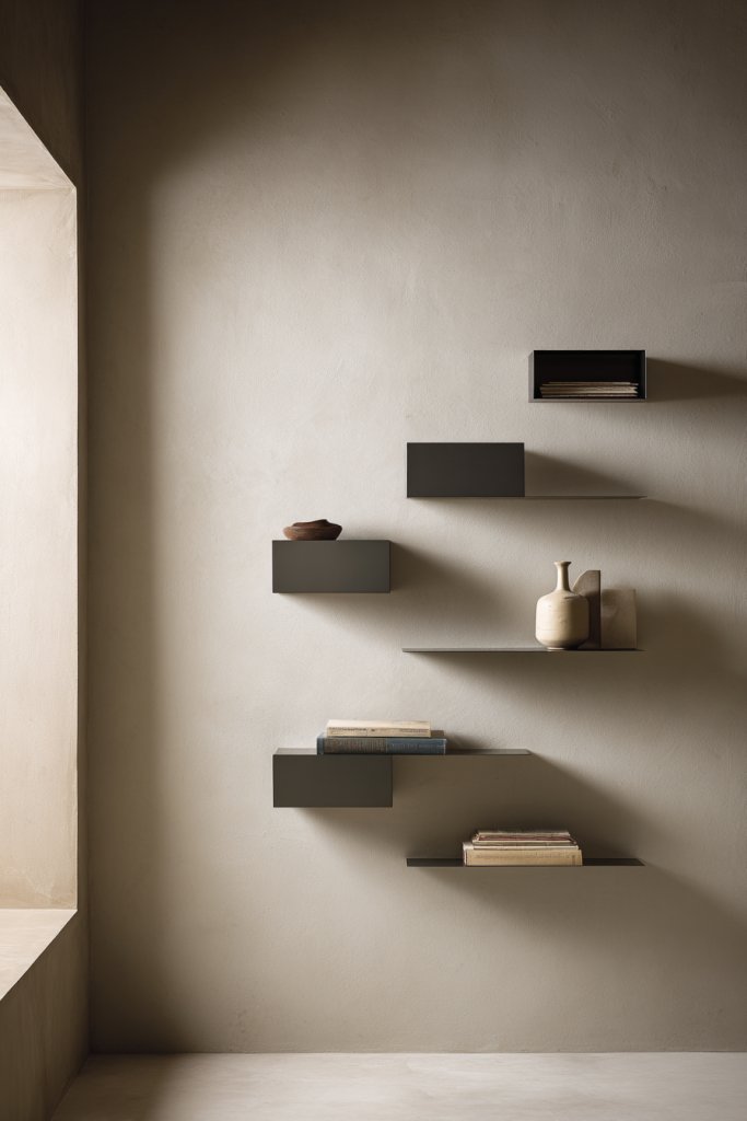 Visualize slim, matte black or natural wood shelves floating against a neutral wall. They hold carefully curated items—like a few books, ceramics, or decorative boxes—organized in a balanced way. The open design keeps the room feeling airy, while the clean lines add modern elegance. The overall look is simple yet sophisticated, emphasizing openness and order.