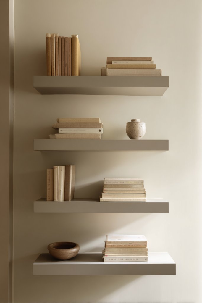 Envision a wall with a row of open shelves holding colorful cookbooks, vintage kitchen tools, and decorative jars. The mix of textures and heights adds visual interest. The books are arranged with some lying flat and others upright, creating a dynamic display. Light-colored ceramics or wooden accents complement the books, making the space feel curated and warm.