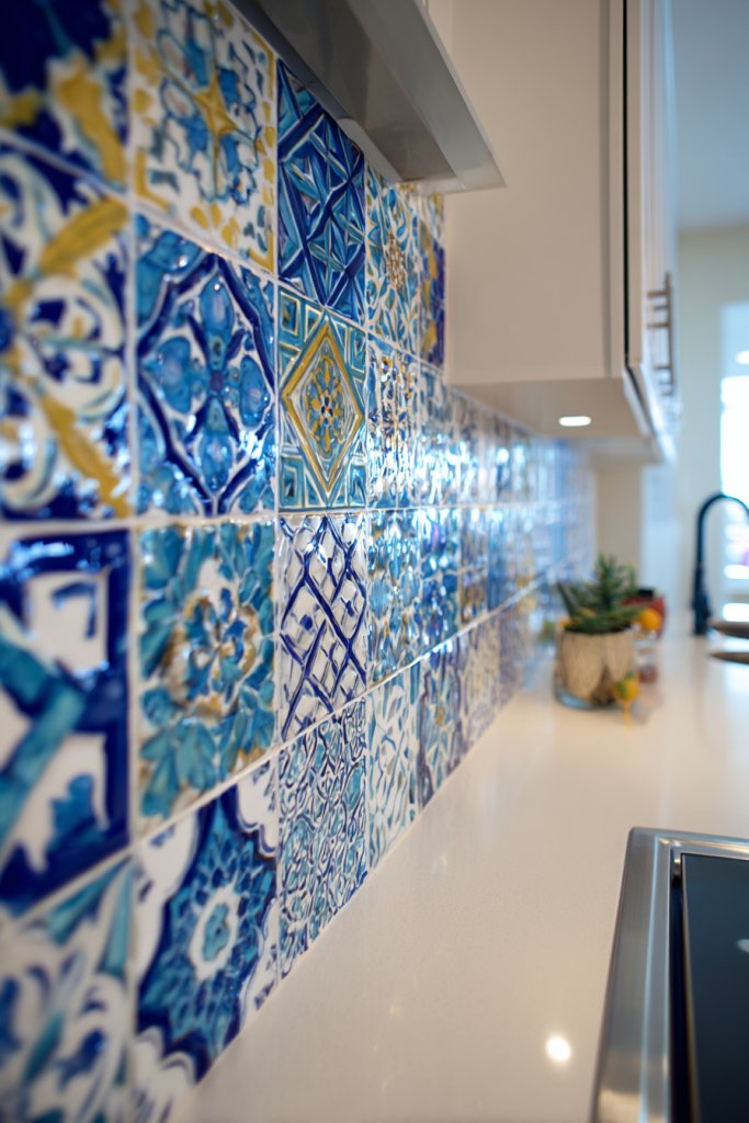 Picture a wall behind your stove covered in colorful, patterned ceramic tiles with intricate geometric or floral designs. The glossiness reflects light, making the space feel brighter. The textures and patterns create visual depth, transforming a plain wall into an eye-catching feature. The contrast with neutral cabinetry makes colors pop even more.