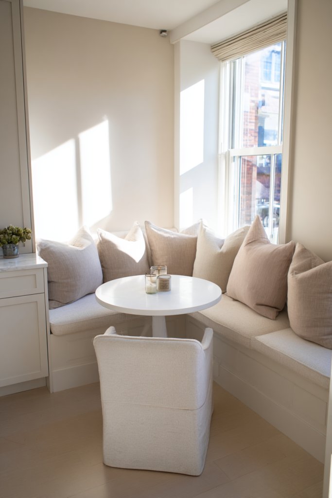 Picture a corner with built-in bench seating upholstered in a soft fabric, paired with a small round table. Decorative cushions and a warm throw add comfort and personality. The space is framed with windows that flood it with natural light, making it perfect for mornings. A pendant or wall-mounted light enhances the cozy vibe.