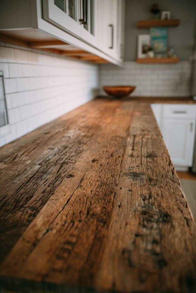 Visualize a kitchen with thick, live-edge wooden countertops paired with vintage-style cabinets. The grain patterns and knots in the wood add texture and character. Under soft lighting, the warm tones glow, creating a welcoming atmosphere. The countertops look like they’ve been part of the home for generations, blending rustic charm with modern function.