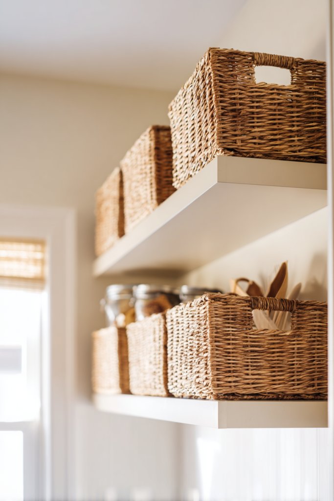Visualize a kitchen shelf lined with woven wicker baskets filled with flour, sugar, and coffee beans. Nearby, vintage crates hold utensils or napkins, creating a cozy, lived-in vibe. The natural textures and warm tones of the baskets contrast with sleek countertops, adding visual interest. This setup invites you to grab what you need without fuss.