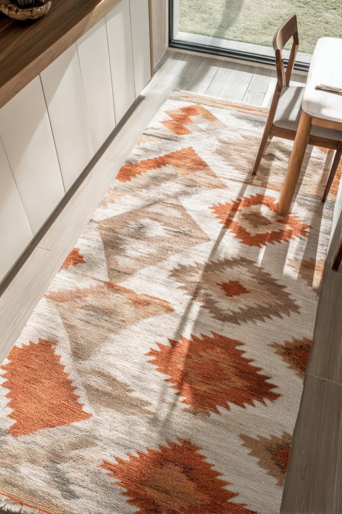 Picture a geometric rug with bold black and white shapes placed in front of the sink, or a floral-print rug under a breakfast nook. The textures invite barefoot comfort, while the patterns add visual excitement. Light catches the fibers, highlighting their intricate designs. It’s a perfect balance of style and practicality, making your kitchen feel layered and lived-in.