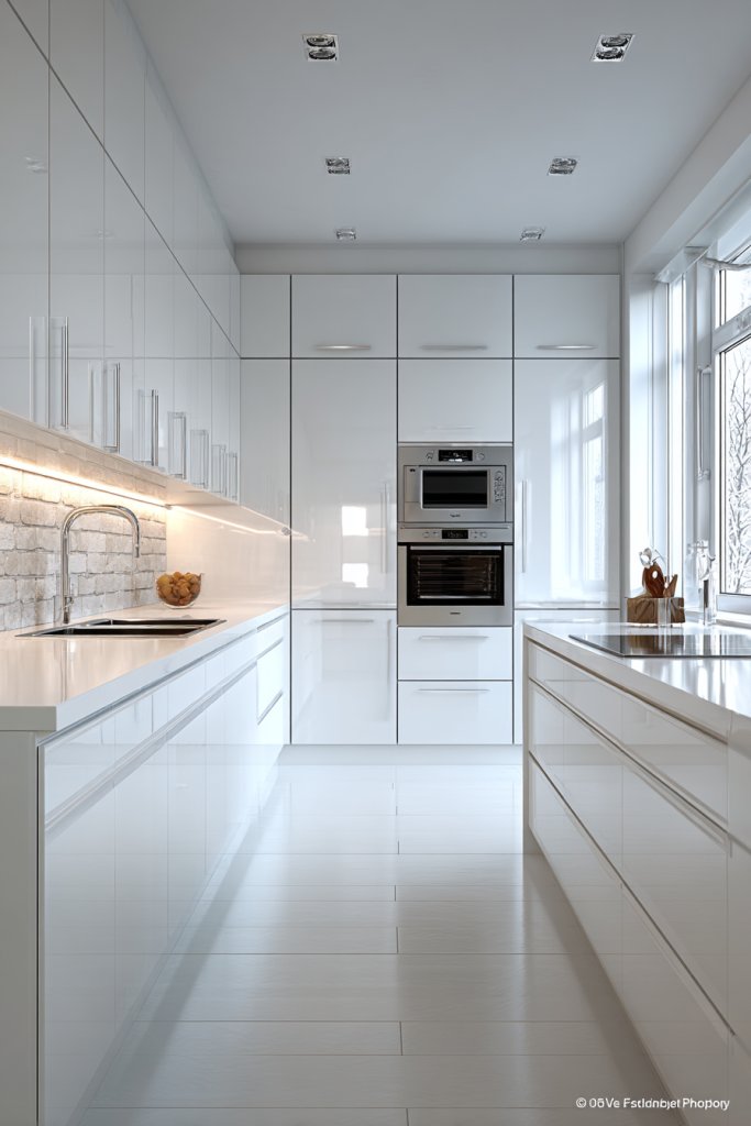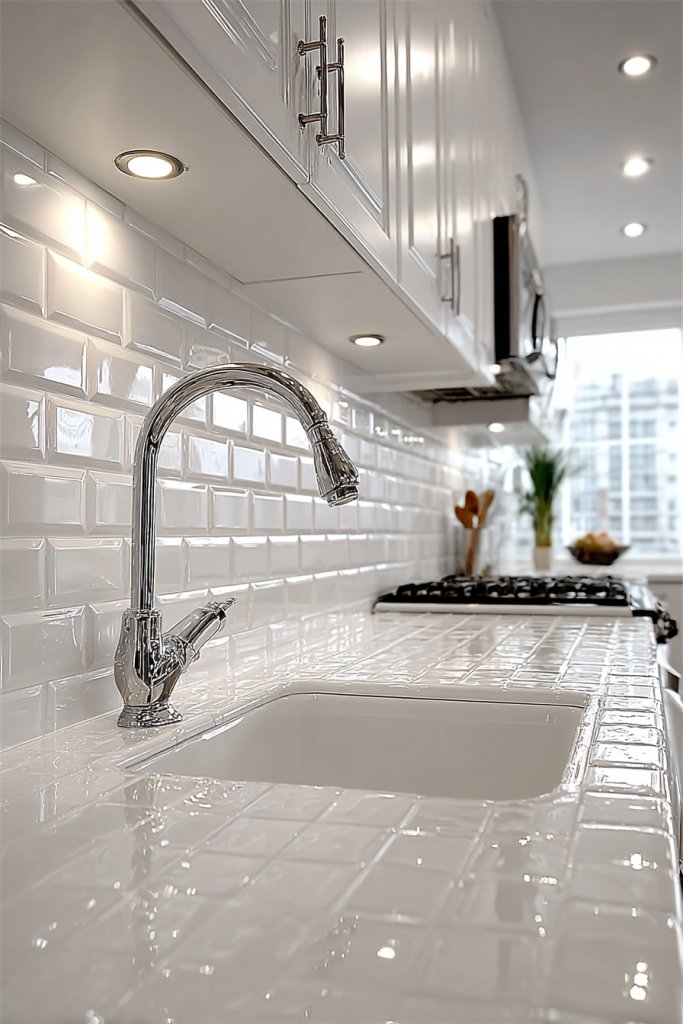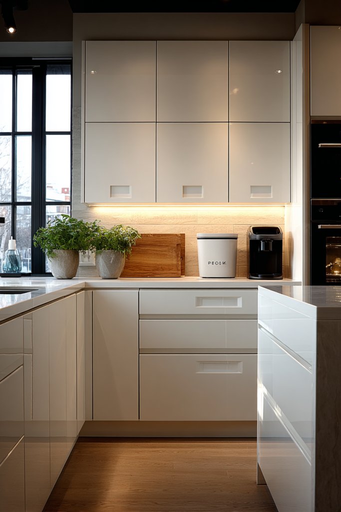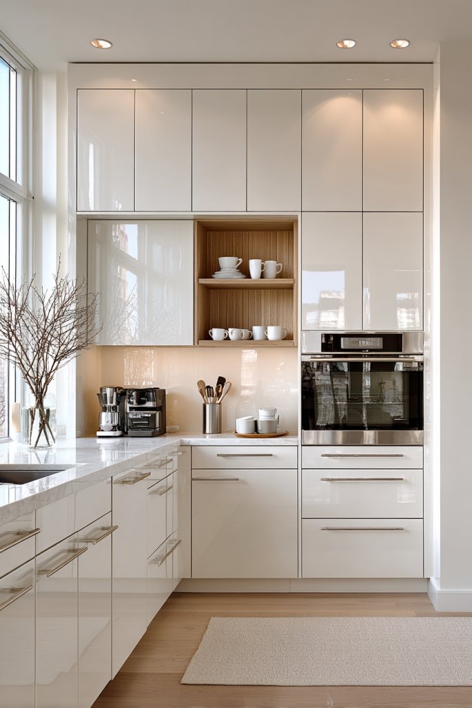 Add warmth with textured or patterned backsplashes, or introduce natural materials like stone or wood countertops. Use open shelving or glass-front cabinets to display curated dishware. Incorporate accessories like minimalist bar carts or decorative trays for functional elegance. Keep clutter hidden inside spacious cabinets for a tidy look that always feels fresh.