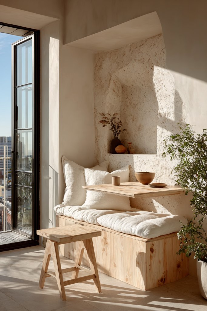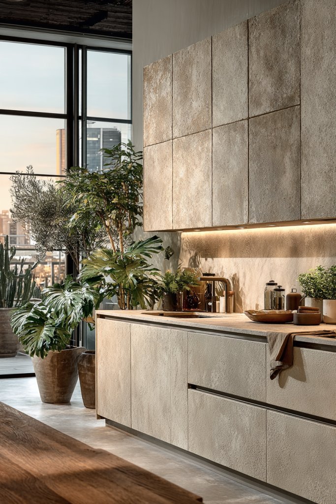 Opt for textured wood, concrete, or plaster finishes for warmth and natural appeal. Combine with smooth surfaces in accents or hardware for contrast. Use neutral textiles like linen or cotton for curtains and mats to soften the look. Seasonal accents in muted or pastel shades can be layered in to keep the space feeling fresh. Match with metallic or matte hardware for a modern twist.