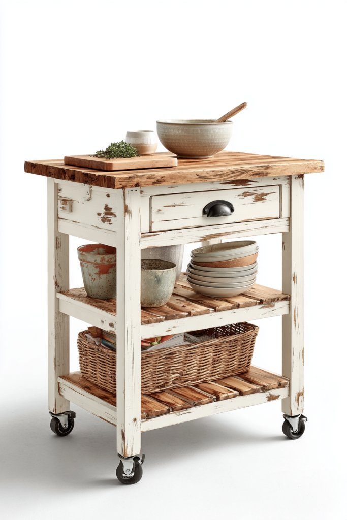 Imagine a sleek, wheeled cart with open shelves and a sturdy top surface, painted in a neutral tone or natural wood finish. It’s positioned near your main workspace, ready to hold utensils, ingredients, or small appliances. When not in use, it can be moved to another corner or stored away. The cart adds an industrial-chic touch, blending practicality with aesthetic appeal, and enhances your kitchen’s flexibility.