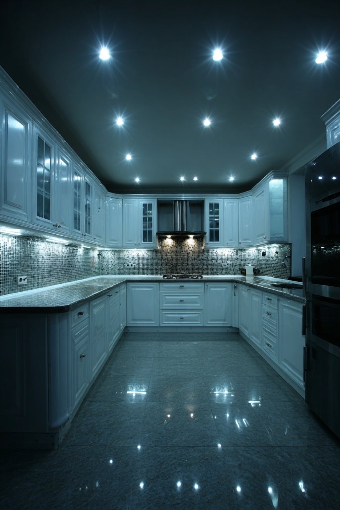 Imagine a ceiling dotted with sleek, flush-mounted LED cans, casting a soft, even glow across the entire room. The lights are positioned strategically over work zones, highlighting countertops, islands, and sinks. The minimal design blends into the ceiling, creating a modern, uncluttered look. Shadows are minimized, and every surface feels bright and inviting—a perfect environment for cooking, cleaning, or relaxing.
