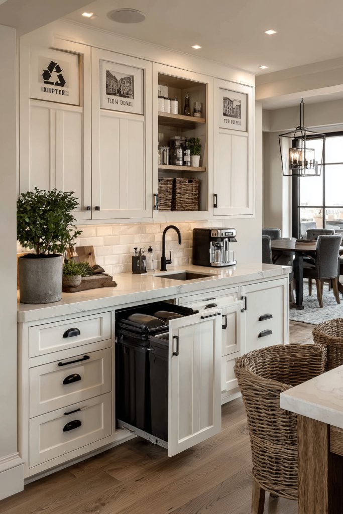 Imagine a custom cabinet tucked under the sink or beside the pantry, with pull-out drawers that conceal trash and recycling bins. The doors close seamlessly, maintaining the clean lines of your cabinetry. When needed, you slide out the bins, which are neatly lined up in durable, odor-sealing containers. The design ensures the waste area remains out of sight, yet within reach for quick disposal.