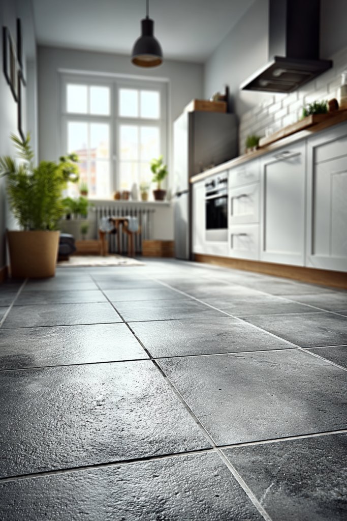 Picture a kitchen with large-format ceramic tiles in a matte finish, laid in a subtle pattern. The surface is resistant to scratches and stains, with grout lines that are easy to clean. Alternatively, a seamless vinyl plank mimics wood with added durability, while a sealed hardwood offers warmth and classic appeal. The flooring complements your cabinets and countertops, creating a cohesive, inviting environment that withstands daily wear.