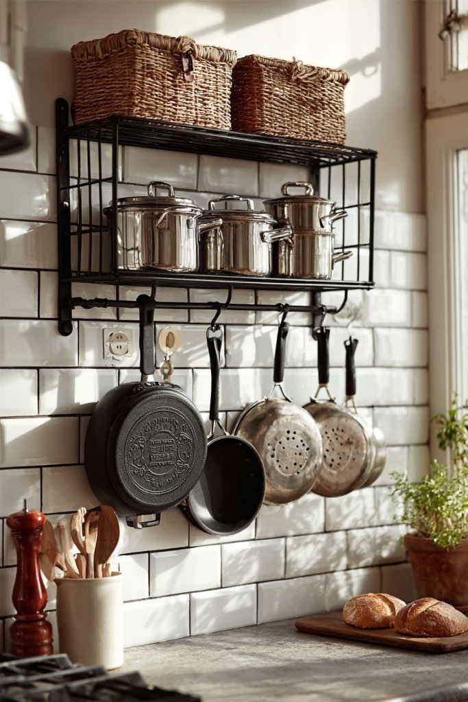 Choose from wall-mounted racks, ceiling-mounted rails, or freestanding towers depending on your space. For a rustic look, opt for wrought iron or reclaimed wood racks; for a modern vibe, go with sleek stainless steel. Consider adding hooks for utensils or small tools to keep everything in one place. Adjust the height and spacing to accommodate larger or specialty pots. Seasonal swaps can include decorative elements like string lights or decorative chains.