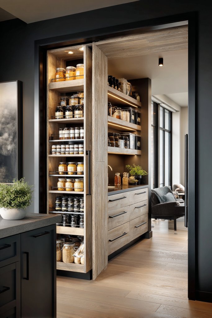 Visualize a tall cabinet with sleek, chrome-trimmed pull-out shelves filled with labeled jars, cans, and snack boxes. As you slide the shelves out, everything becomes instantly visible—no more reaching or rummaging. The shelves are adjustable, allowing you to customize heights for different items. The system glides smoothly, feeling more like a luxury feature than a mundane storage solution. The organized chaos of your pantry now looks like a curated store display.