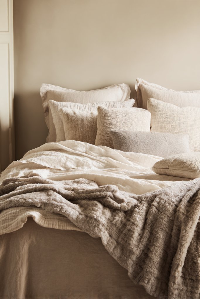 Switch to warmer or cooler neutrals depending on the season or your mood. For summer, consider lighter shades like blush or cream, while winter calls for richer taupes. If you prefer minimalist looks, stick with monochrome textures; for more eclectic vibes, mix different plush fabrics. Small bedrooms benefit from lighter hues to open up space, while larger rooms can handle darker, more dramatic textures. Feel free to incorporate different textiles like faux fur, chenille, or quilted fabrics.