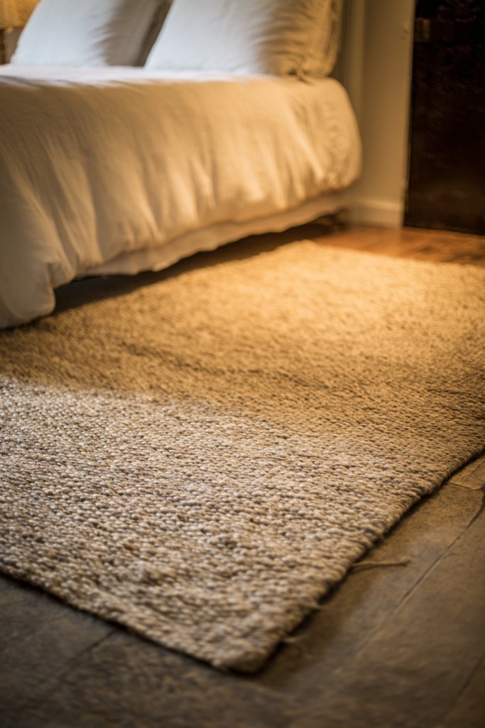 Imagine a large, textured wool or jute rug spreading out under your bed, its natural fibers adding earthy warmth. The tactile surface invites barefoot walks and adds visual softness to the room’s design. Light plays off the fibers, creating subtle shadows that enhance the cozy atmosphere. The rug’s neutral tones blend seamlessly with various decor styles, from rustic to modern minimalist. It grounds the space and makes it feel complete.