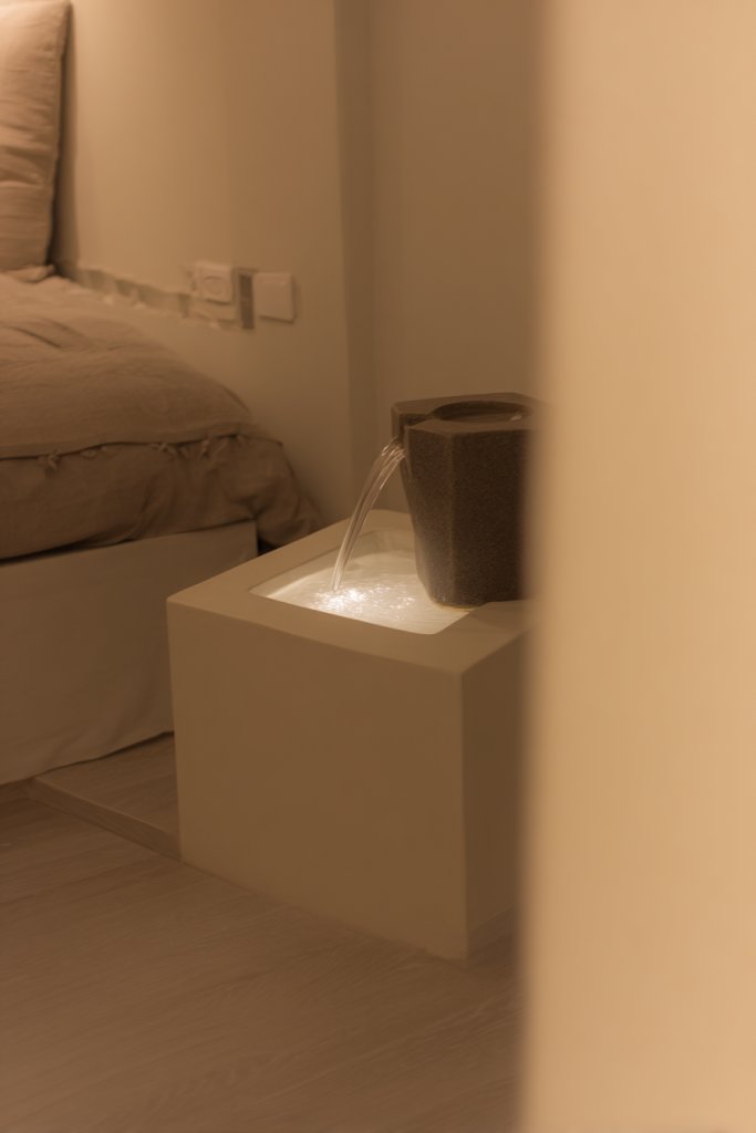 Imagine a compact, elegant water fountain on a side table or niche, with water flowing softly over stones or sculptural elements. The gentle sound fills the room with serenity, masking outside noise. The visual movement of water adds a dynamic, peaceful touch to your decor. Soft lighting or candles nearby enhance the calming mood. It’s a small feature with a big impact on your mental well-being.
