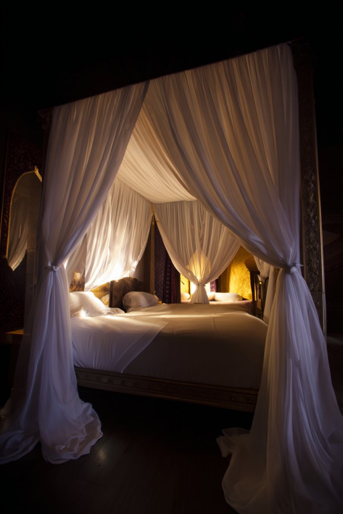 Imagine a tall, regal bed frame draped with sheer, billowing curtains in a soft, airy fabric. The fabric flows gently in the breeze, adding movement and softness to the room. Rich, textured bedding complements the canopy, while subtle lighting accentuates the drapes’ delicate folds. The overall aesthetic is luxurious yet inviting, evoking elegance and comfort. It’s a visual statement that anchors the room’s design.