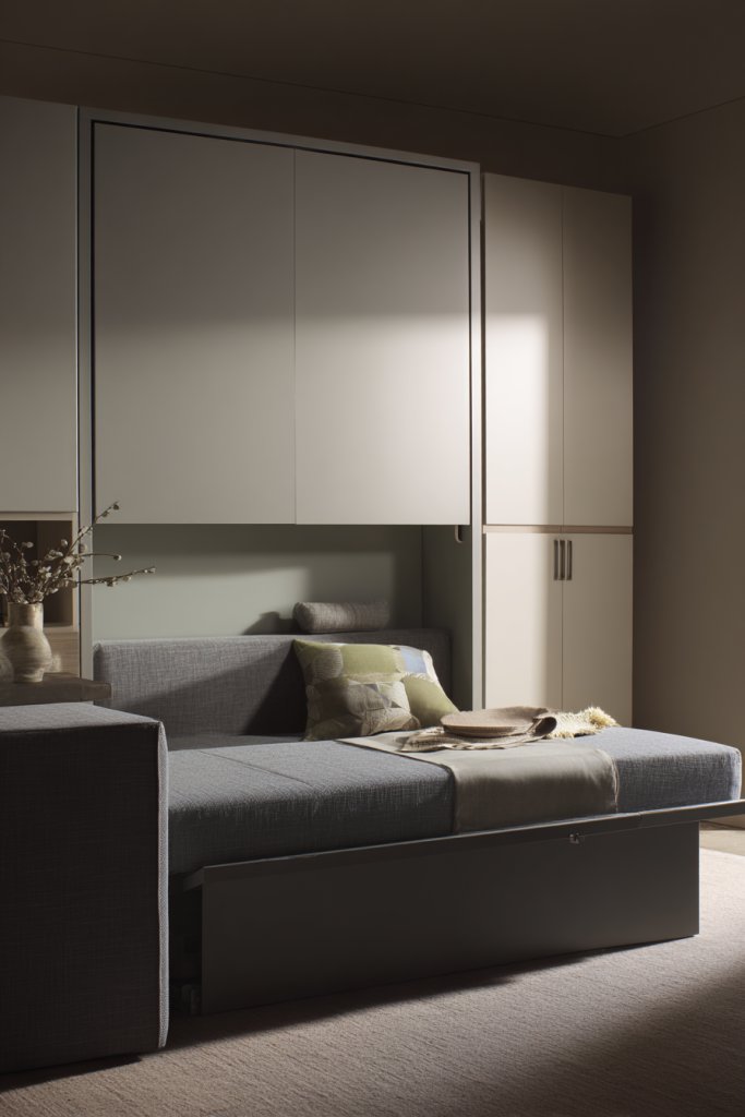 Imagine a plush chaise lounge or a small sectional with built-in storage, tucked into a corner. It’s layered with soft cushions and textured throws, inviting you to relax. A side table or ottoman doubles as storage or a footrest, making the space both functional and cozy. Ambient lighting and a few decorative accessories finish the scene. It’s a peaceful haven tailored to your needs.