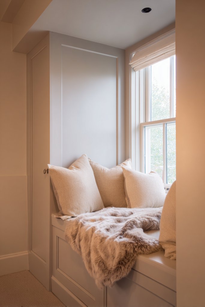 Start by choosing a quiet corner or alcove in your bedroom. Build or modify existing cabinetry to create a custom seating area—this could be a simple wooden frame with a cushioned top. Layer with comfortable upholstery and soft textiles for added comfort. Install lighting that’s easy on the eyes, avoiding harsh overheads. Add storage or shelves for books and decorative items. Keep the design simple yet cozy to maximize relaxation.