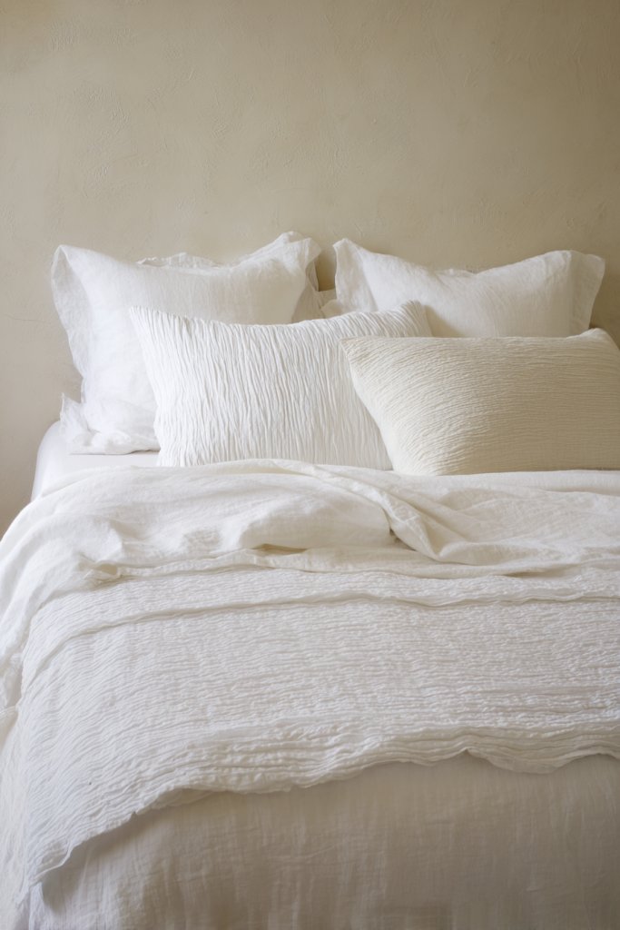 Envision crisp white linen sheets layered with a variety of soft, textured pillows and a plush duvet. The fabric’s natural wrinkles add a relaxed, inviting charm. A fluffy, white throw blanket drapes softly at the foot of the bed, inviting touch. Light filters through sheer curtains, illuminating the clean, crisp aesthetic. The overall look is serene, uncluttered, and ready for restful nights.