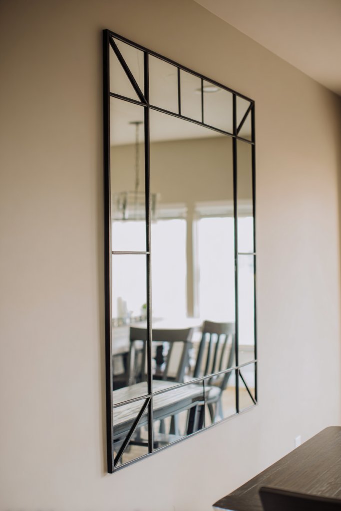 Envision a large rectangular mirror with a matte black or bronze metal frame, hung strategically opposite a window or light source. The reflective surface amplifies the room’s brightness, bouncing light around and creating a sense of depth. The industrial frame adds a bold, contemporary edge that complements exposed beams or rustic furniture. The mirror’s sleek silhouette contrasts nicely with textured walls, adding visual interest and sophistication.