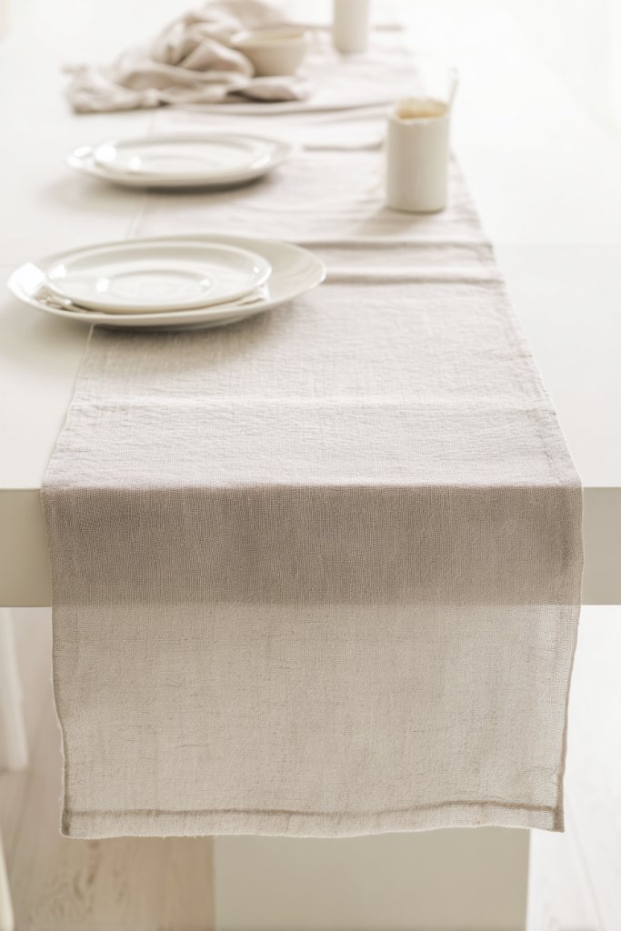 Visualize a soft, cream-colored linen runner draped across a rustic wooden table, with neatly arranged place settings. Minimalist ceramic plates, simple cutlery, and cloth napkins create a clean, cohesive look. The texture of the linen adds a tactile layer, inviting guests to touch and feel the quality. Candles or small decorative accents can be added for ambiance, but the focus remains on understated elegance. It’s a look that’s both relaxed and refined.