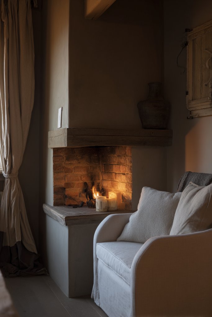 Visualize a small, rustic fireplace built into a corner with a brick or stone surround, topped with a wooden mantel. Soft, plush cushions and a textured throw invite you to settle in. Nearby, a cozy armchair or small side table holds your favorite drink or a stack of books. The flickering flames cast a gentle glow, creating a warm, intimate atmosphere. It’s the perfect complement to a farmhouse dining setup that’s both functional and charming.