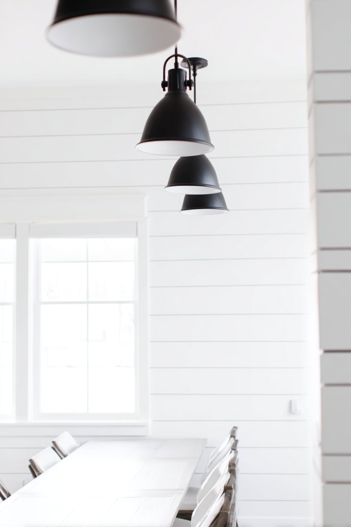2. White Shiplap Walls with Black Metal Pendant Lighting