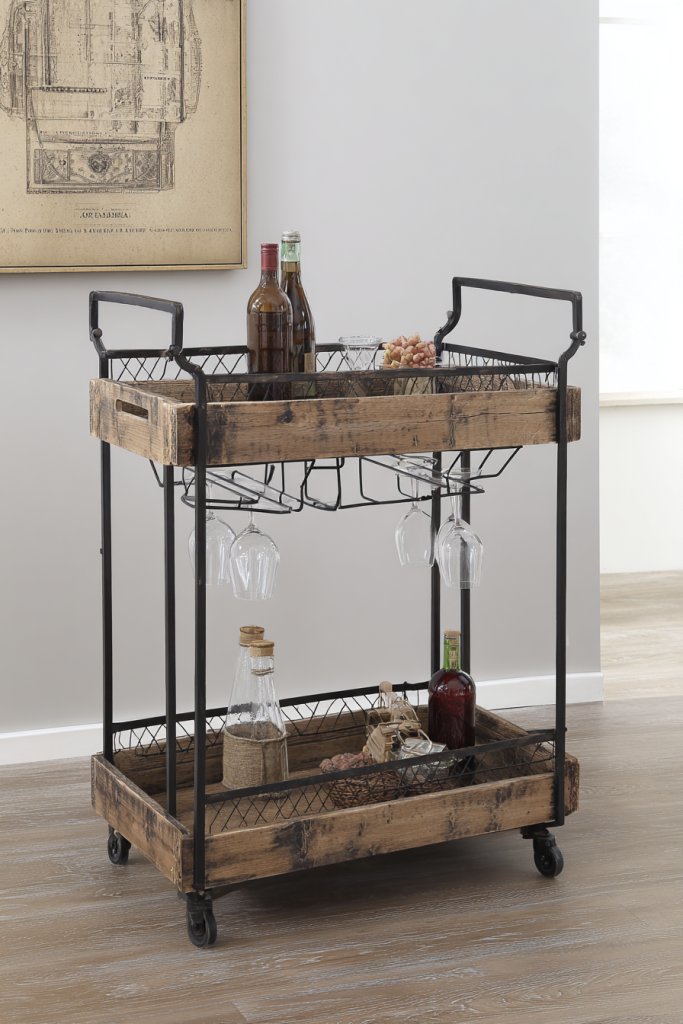 Picture a distressed wooden cart with metal wheels, topped with a tray of vintage glassware and a few carefully curated bottles. It’s positioned near your dining area, ready to serve or entertain. The cart’s open shelves hold baskets of snacks or seasonal decor, while hooks underneath store utensils or small towels. The overall look is nostalgic yet practical, with a hint of industrial flair. It’s a centerpiece that invites gathering and conversation.