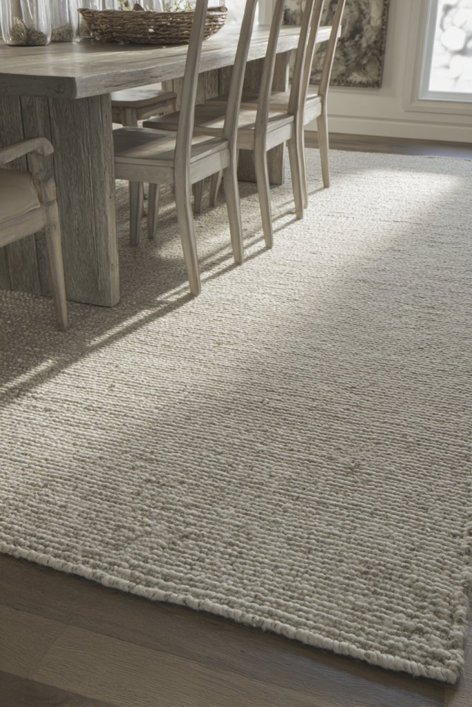 Visualize a textured jute or sisal rug stretching beneath your farmhouse table, its natural fibers adding subtle depth. The neutral hue complements painted furniture, wooden accents, and soft textiles. The rug softens the room’s acoustics and adds tactile interest. Light filters in, highlighting the weave’s intricate pattern. The overall effect is a calm, cohesive space that beckons guests to linger.