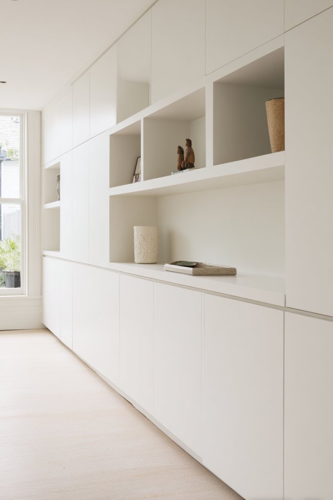 Visualize a streamlined, painted-in-a-soft neutral hue, built into the wall with open shelves and closed cabinets. The open sections display your favorite dishes or decorative bowls, while the closed sections hide less attractive items. The design incorporates clean lines, with a mix of open and closed storage for visual balance. Nearby, a vintage scale or woven baskets add texture and authenticity. The entire setup feels thoughtful, organized, and effortlessly stylish.