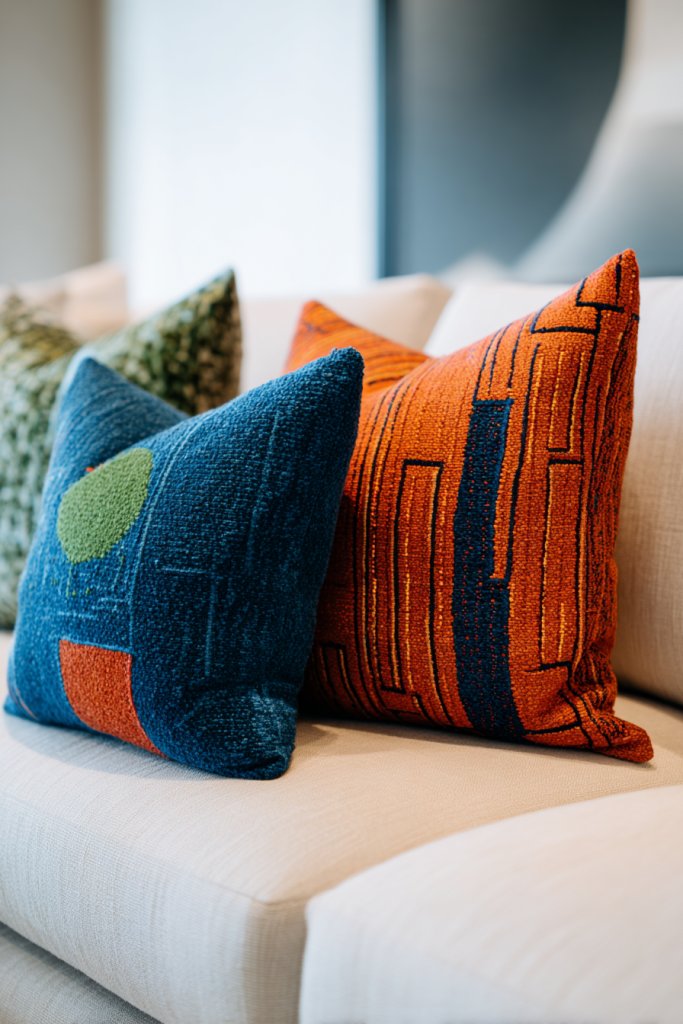 10. Bold Accent Pillows in Textured Fabrics and Modern Patterns