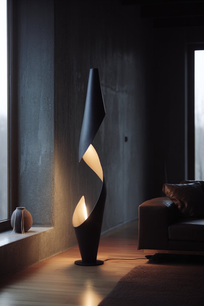 Picture a tall, sleek lamp with a twist—literally—like a winding metal sculpture reaching for the ceiling. Its matte black finish contrasts beautifully with a soft neutral wall, casting warm, inviting light. The lamp’s form adds depth and texture, making it feel like a chic sculpture rather than just a light source. When you flick the switch, the play of shadows and light creates a cozy, modern atmosphere.