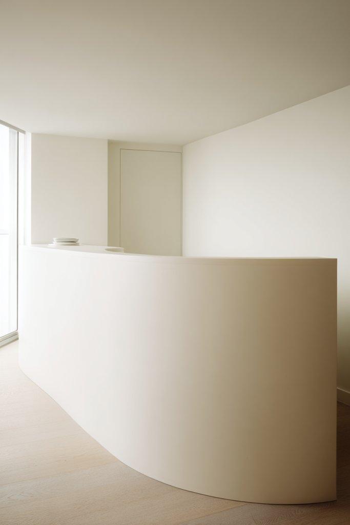 Visualize a smooth, rounded wall section that curves naturally into your space, finished in warm plaster or painted in a soothing color. Its gentle arc guides the eye and encourages movement. When light hits the curve, it casts soft shadows, adding depth and interest. This design element creates a harmonious transition between zones.