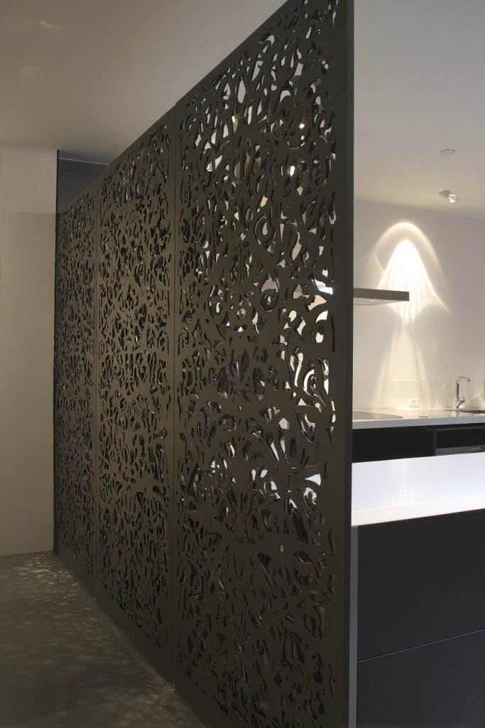 Imagine a large metal panel featuring detailed geometric or floral cutouts, finished in matte black or metallic tones. The intricate patterns cast delicate shadows when backlit or illuminated, creating a mesmerizing effect. When placed strategically, they define a zone while serving as a piece of art. The blend of form and function elevates your entire space.