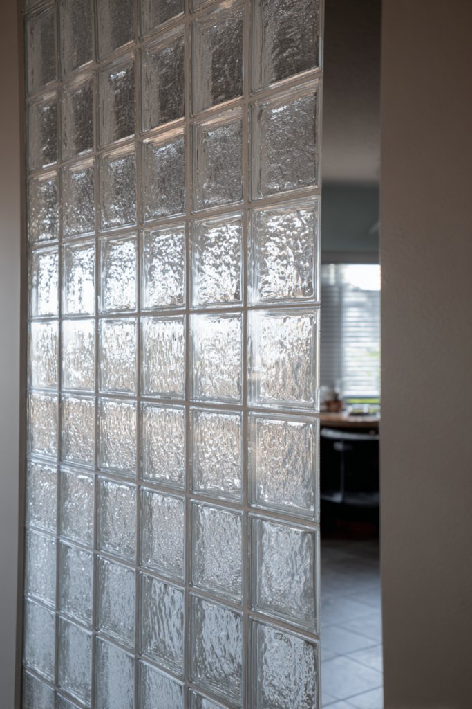 Imagine a wall of textured glass blocks arranged in a geometric pattern, shimmering softly as light passes through. The blocks blur the view, providing privacy while still inviting light in. Their chunky, tactile surface adds a distinctive architectural element that complements contemporary or vintage decor. When illuminated from behind, they glow warmly, creating a cozy atmosphere.