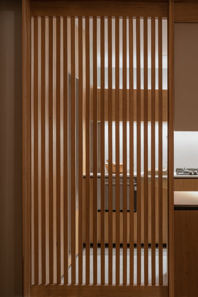Picture a vertical array of evenly spaced wooden slats forming a semi-private barrier. The natural wood grain varies from light oak to dark walnut, adding depth and character. When light filters through the gaps, it creates playful shadows on the floor and walls. The slats serve both aesthetic and functional purposes, defining zones with subtle elegance.