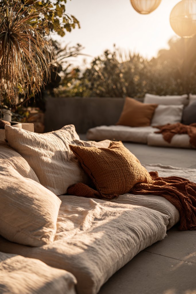 1. Cozy Lounge Area with Oversized Outdoor Cushions and Throws