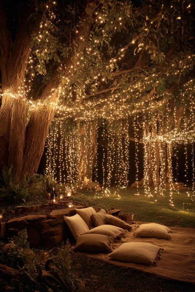 Visualize dozens of delicate string lights draped in a crisscross pattern over your seating area, creating a shimmering ceiling. The warm glow illuminates faces and highlights textures of furniture and decor below. Surrounding trees or posts support the lights, adding a whimsical touch. Cushions and throws in cozy fabrics are scattered around, inviting relaxation. As evening falls, the space glows softly, resembling a starry night come to life right in your backyard. It’s pure magic.