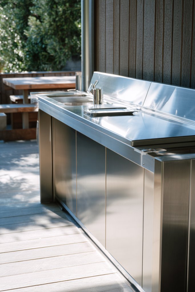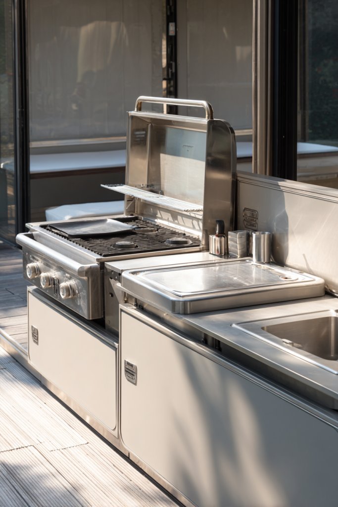 Picture a sleek, weatherproof countertop with a compact grill, a cutting board, and storage for utensils and ingredients. Nearby, a small sink or prep station allows for easy meal prep and cleanup. The setup is organized and efficient, with cabinets or shelves for essentials. Ambient lighting and a durable outdoor rug complete the scene. It’s a practical yet inviting space where you can cook, serve, and socialize—all in the fresh air.