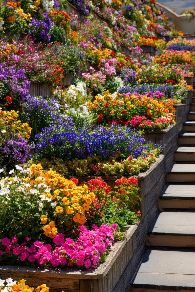 13. Tiered Planting Beds with Bright Seasonal Flowers