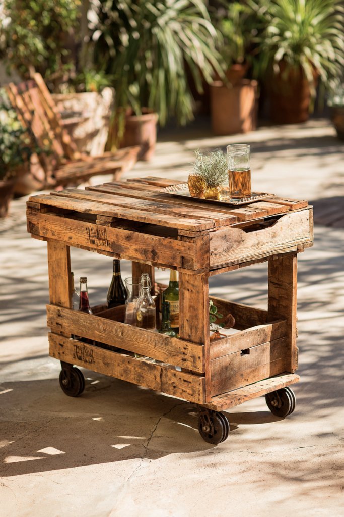 Picture a sturdy pallet frame, expertly disassembled and reassembled into a mobile bar with shelves and compartments. The wood retains its weathered charm, adding warmth and texture. Mismatched vintage hardware or paint accents enhance the rustic look. The top surface is perfect for mixing drinks or setting out snacks, with space underneath for bottles and glasses. The bar can be rolled to different spots, making it versatile and fun. It’s a functional piece that looks like a piece of art.