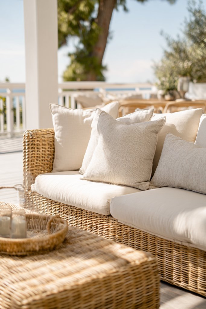 Opt for all-weather rattan in natural or dark finishes to match your aesthetic. Mix and match cushions and throws in various textures and colors for a personalized look. Small outdoor ottomans or poufs can add flexibility to seating arrangements. Incorporate a few decorative accents like lanterns or small planters—avoiding clutter—to keep the space sophisticated. For colder months, add cozy blankets or outdoor heaters to extend usability.