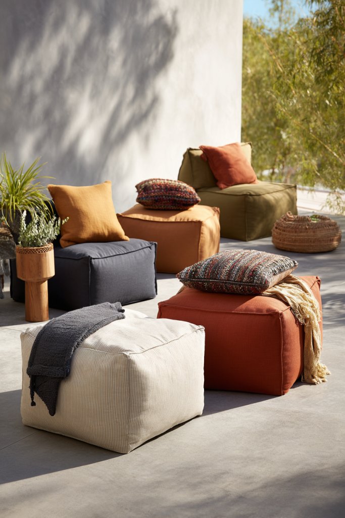 Choose poufs in bold patterns or neutral tones, depending on your decor style. Mix and match sizes and colors for eclectic charm or keep it uniform for a more streamlined look. Use weatherproof, washable fabrics for easy maintenance. Place the poufs on a durable outdoor rug or directly on the patio surface. For colder months, add throws or cushions to increase comfort. Incorporate small tables or ottomans for added functionality.