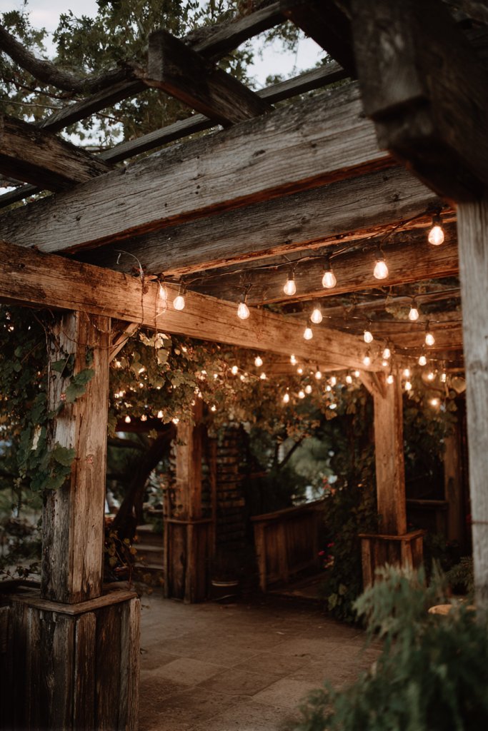 Picture sturdy reclaimed wood beams forming a lattice overhead, with natural textures that blend seamlessly with garden surroundings. Delicate string lights are woven across the top, casting a warm, flickering glow as dusk settles in. Climbing vines or curtains in light fabrics can soften the structure and add privacy, while a backdrop of greenery or a stone wall enhances the rustic vibe. The overall scene feels organic, warm, and welcoming—like stepping into a countryside escape.