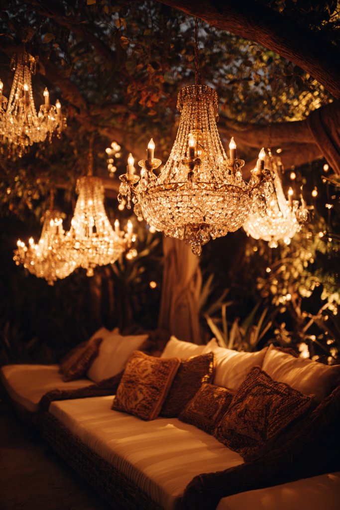 Visualize a large, ornate chandelier hanging from a sturdy pergola or overhead beam, casting a warm, sparkling glow. Surrounding it, fairy lights or smaller lanterns add layers of light and texture. The chandelier’s intricate design contrasts beautifully with natural or modern decor, creating a sophisticated scene. Cushions, drapes, and a layered rug beneath complete the look. The overall effect is both glamorous and inviting—perfect for entertaining in style.