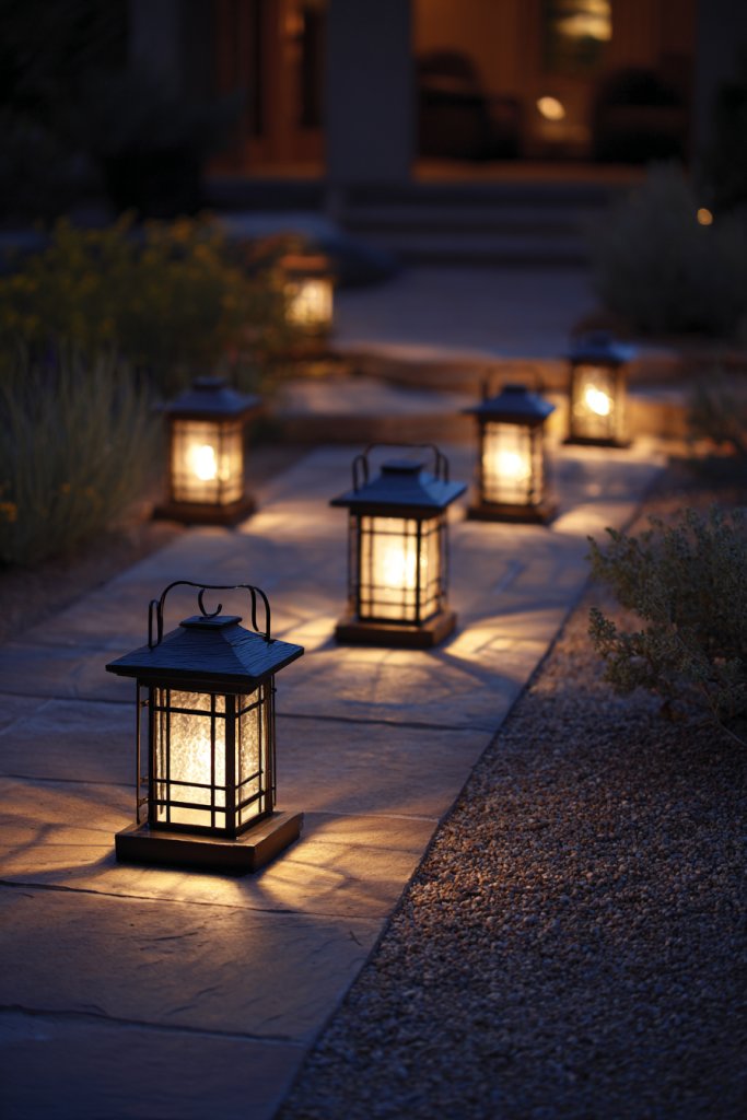 Imagine a winding stone or gravel path lined with small solar lanterns that cast a soft, flickering glow. Larger lanterns or stake lights mark the way, creating a charming, inviting corridor. The lights’ warm hue highlights garden features, flower beds, or patio edges without overwhelming the scene. As night falls, the pathway becomes a glowing ribbon guiding guests or family safely through your outdoor space. It’s a cozy, magical ambiance that invites exploration.