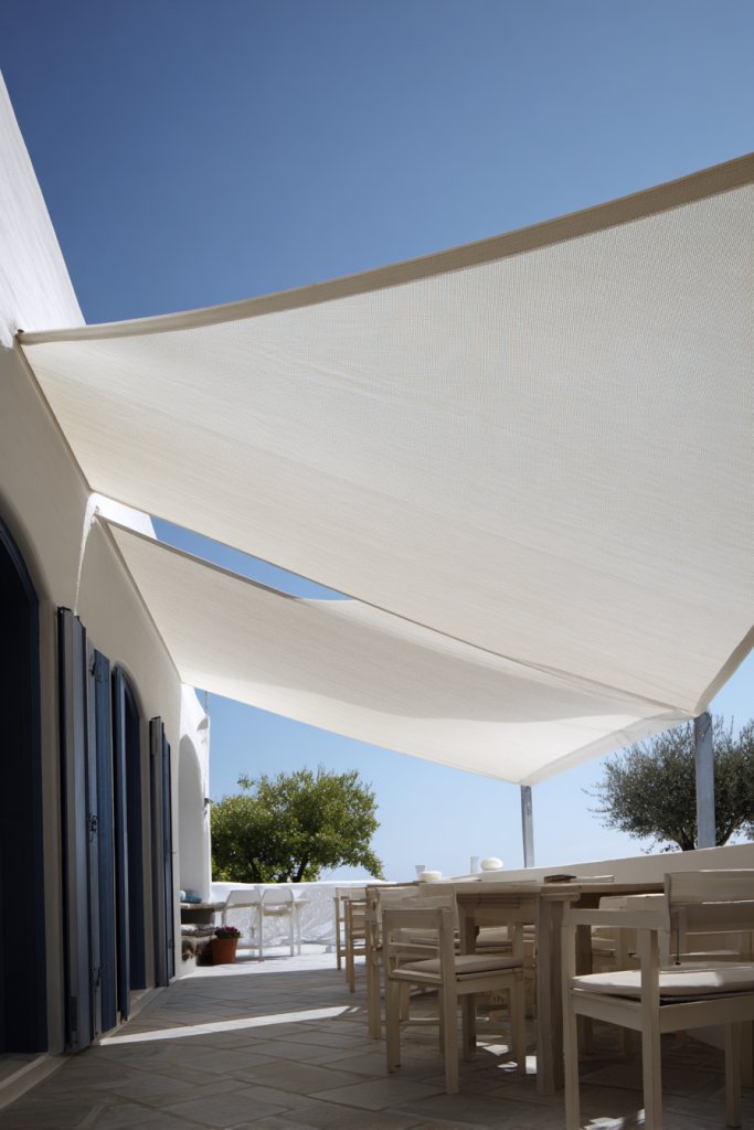 Visualize a large, triangular shade sail in a vibrant color stretched taut above your seating area, anchored to sturdy posts or your house. The fabric drapes softly, creating a smooth, flowing canopy that filters sunlight beautifully. Beneath it, cozy furniture, cushions, and a small table invite relaxed lounging. The fabric’s color and texture contrast with natural elements like trees or stone, adding visual interest. During the day, it provides relief from the sun; at dusk, it frames the scene in gentle, dappled light.