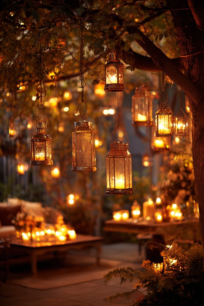 24. Hanging Lanterns and Candles for Intimate Atmosphere
